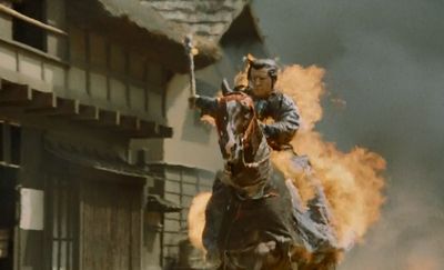 映画『タワーリング・インフェルノ』などを手掛けたファイアースタントコーディネーターのジョージ・フィッシャーによる「人馬諸共、火だるまになりながら疾走する」アクションシーン。多賀谷六兵衛(長門裕之)が油をかぶり、自ら火をつけて馬を走らせた。