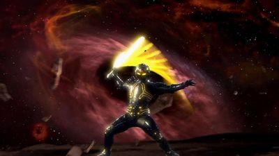 ジャスピオンの必殺技「コズミックハーレー」とギャバンダイナミックを融合させたネーミングでしょうが、ちと長いかも(笑)。でもジャスピオンの幻影を背にソードを振りかざすギャバンが良いし、中々パワフルな技でした。あえて贅沢を言うならやはりジャスピオンも登場させて話に絡ませてほしかった。マッドギャランが大量殺戮兵器として蘇らせたサタンゴースをデカレンジャーのデカウイングキャノンがシャイダーのシューティングフォーメーションのような感じであっさり破壊してしまったのがちょっと納得行かなかった(苦笑)。あそこはやはりドルギランに出てきてもらいたかったですね。