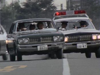 燃え上がるパトカーを飛び越える水原刑事(藤竜也)が乗る車。この車は初代の三菱コルトギャラン。劇中で使われたのは角型2灯スタイルの前期型セダン。ジャンプで炎の中を突っ切るコルトギャランの雄姿はとても見応えがありました。