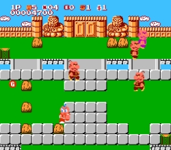 このゲームもそうなんですが、あの頃は、スーパーマリオが流行った影響もあるのか、8ワールド4ステージ構成のゲームが多かった。そう言えば、このゲームもスーパーマリオと同じく隠し通路を使ってあっという間に最終ワールドにたどり着くことができるのですが、しかし、宝箱に入っているアイテムを揃えずに最終ワールドに行ってしまうととんでもない目にあってしまいます…。パンチ力が低いと倒せない敵もいるし、魔除けや巻物や鏡なども欠かせないアイテムなので、これらを取り損ねると後で苦労します。順番通りに進めても3ワールド辺りで敵の猛攻にあってゲームオーバーになることが多かった。そうそう岩を殴って「G」のマークが入っているボールを取ると、スーパーマリオみたいにファイヤーボールを出せます。敵を倒すと、なぜだかスーパーマリオでレンガを破壊した時のような砕けた音がするのですが、妖魔軍団の正体は、石なんでしょうかね。SEの担当者がスーパーマリオと同じ人だったと言う噂も聞きますが…。
