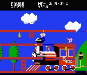 マピ子さんにプレゼントするクリスマスツリーを集めるため、蒸気機関車をバックに駆け回るマッピー。レイルロードタウンでは、滑車を使ってニャームコ達を攻撃する事が可能。ねこじゃらしだけでなく小判も足止めの道具として出てくるが、なぜゆえに小判???ああ、なるほど「猫に小判」と言う事ですか…(苦笑)。