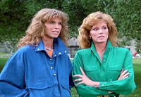 ・・・ではなくて、左の青い服のセクシーな美女の方、アン・ターケル(ANN TURKEL)。モデルとしても活躍し、名優リチャード・ハリスと結婚して、パニック映画の傑作「カサンドラクロス」と「未来元年・破壊都市」で2度共演。離婚後は、「ナイトライダー」に3度ゲスト出演して、「盗まれたナイト2000 知能戦!天才マイコン少年vs.キット(原題:SOUL SURVIVOR)」では、コンピュータの天才ランディ君を操り、マイケルを催眠音楽で眠らせてナイト2000を奪った悪女・アンジェラを演じた。日本語版では、アンジェラと呼ばれていたが、実は、アメリカでは、「エイドリアン・マーゴ」と言う役名になっており、アン・ターケルは、「ナイトライダー3 替え玉博士略奪作戦(原題:GOLIATH RETURN)」で再びエイドリアンを演じている。このエピソードでエイドリアンは、ガースと協力し、再度ナイト2000を奪おうとするのだが、残念ながら、日本では、「日曜洋画劇場」枠でこのエピソードを先に放送してしまったために、本来は、同一のキャラクターとして描かれたエイドリアンが全くの別キャラクター扱いにされてしまっている。