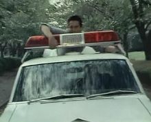 銀行強盗犯たちがパトカーを奪い逃走。西條刑事(永島敏行)は、パトカーのボンネットにしがみつき、そこから移動してパトカーの屋根にしがみつく。強盗犯たちは、西條刑事を振り落とそうと蛇行運転を繰り返し、警察の包囲網を突破しさらに暴走を続ける。強盗犯の一人(蟹江敬三)が車内から西條刑事に発砲。腹部を被弾した西條刑事は、車から振り落とされ、その後も、銃弾を浴び続けて殉職してしまう。西條刑事が殉職回で見せたド派手なしがみつきカーアクションでした。