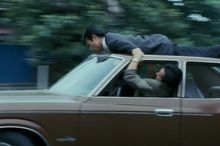 捜査中に二人組の男が乗る車に襲撃される沖田刑事(三浦友和)。犯人の車のボンネットに飛び乗り、そのまま暴走する車の屋根にしがみつく。オープニングテーマ「ワンダフル・ガイズ」をBGMに繰り広げられる三浦友和氏のノースタントのしがみつきカーアクション。電車の高架橋下の長いトンネルを車が暴走する中、車の窓から身を乗り出した犯人と取っ組み合いをしたり、尺の長いど迫力のしがみつきアクションを見せている。