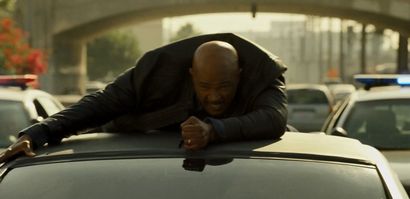 暴走する犯人の車の屋根に必死にしがみつくマータフ刑事。往年の日本の刑事ドラマでもよく見かけた定番のアクションですが、デイモン・ウェイアンズ自身が実際に演じているカットもあります。ちなみにこの車は自動運転の無人車だったため、取調室のシーンでナイトライダーをネタにしたセリフのやりとりがちょっとだけありました(笑。