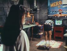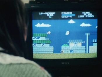 前回、覇悪怒組のひろしくんが「超時空要塞マクロス」のゲームをやっているところを紹介しましたが、30話「魔天郎からの挑戦状」で、ファミリートレーナーの「アスレチック・ワールド」をやっているひろしくんを発見。マクロスの時と同じく、赤いツインファミコンにカセットとマットをセッティングし、ランナー姿になって気合の入ったひろしくんがマット上で走ったりジャンプしたり楽しそうに遊んでおりました。