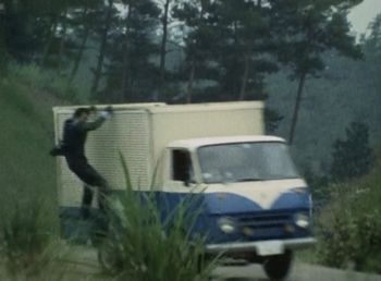 第1話、トラックの荷台にしがみつく中西。他の刑事ドラマや特撮でもよく見かけたアクションですが、小林旭氏がスタントなしでやっています。