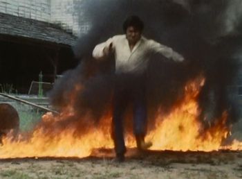 第4話、西部劇のような激しいガンアクションが展開した後、中西がドラム缶を転がし、敵の銃弾によってドラム缶から流れ出したガソリンに火がつく。メラメラと燃え上がる災と黒煙を飛び越えて、中西が姿をあらわし、敵にトドメの一発をくらわす。炎の上を生身で飛び越えるという、下手したら服に火が燃え移ったり火傷しそうな危険なアクションですが、それを難無くこなす姿にしびれた。この3つのアクションシーンはオープニング映像にも使用されています。